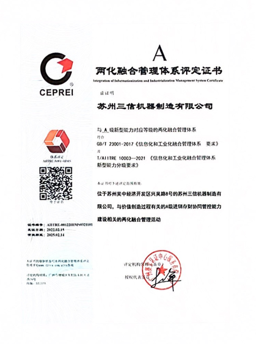 兩化融合管理體系評定證書